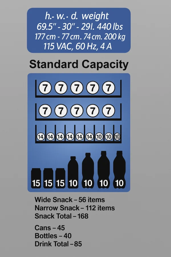 - Total Capacity: 85 drink; 56 snacks; 112 candy